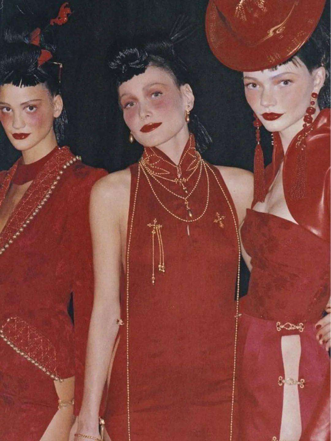 CHRISTIAN DIOR 1997 年的秋冬發表會,時任創意總監 John Galliano 憑藉極富情感且無處安放的浪漫氣息,將華人世界獨有的旗袍文化首次帶入西方世界的伸展台。Galliano 的視野中帶著歷史感,但同時也帶有一種極端的現代感,由傳奇超模 Kate Moss 領軍的模特兒們演繹東方神韻,旗袍勾人的輪廓與東方華麗的絲綢面料在西方臉孔上形成強烈對比。除了以中國紅和經典的立領、盤釦、珠繡、削肩和合身版型作為系列核心,Galliano 也將蕾絲、皮草、連身褲、羅馬領等西方元素融入旗袍之中,使整個系列不僅有中式的優雅嫵媚,更添了一分青春的俏皮與西式的華麗性感。
