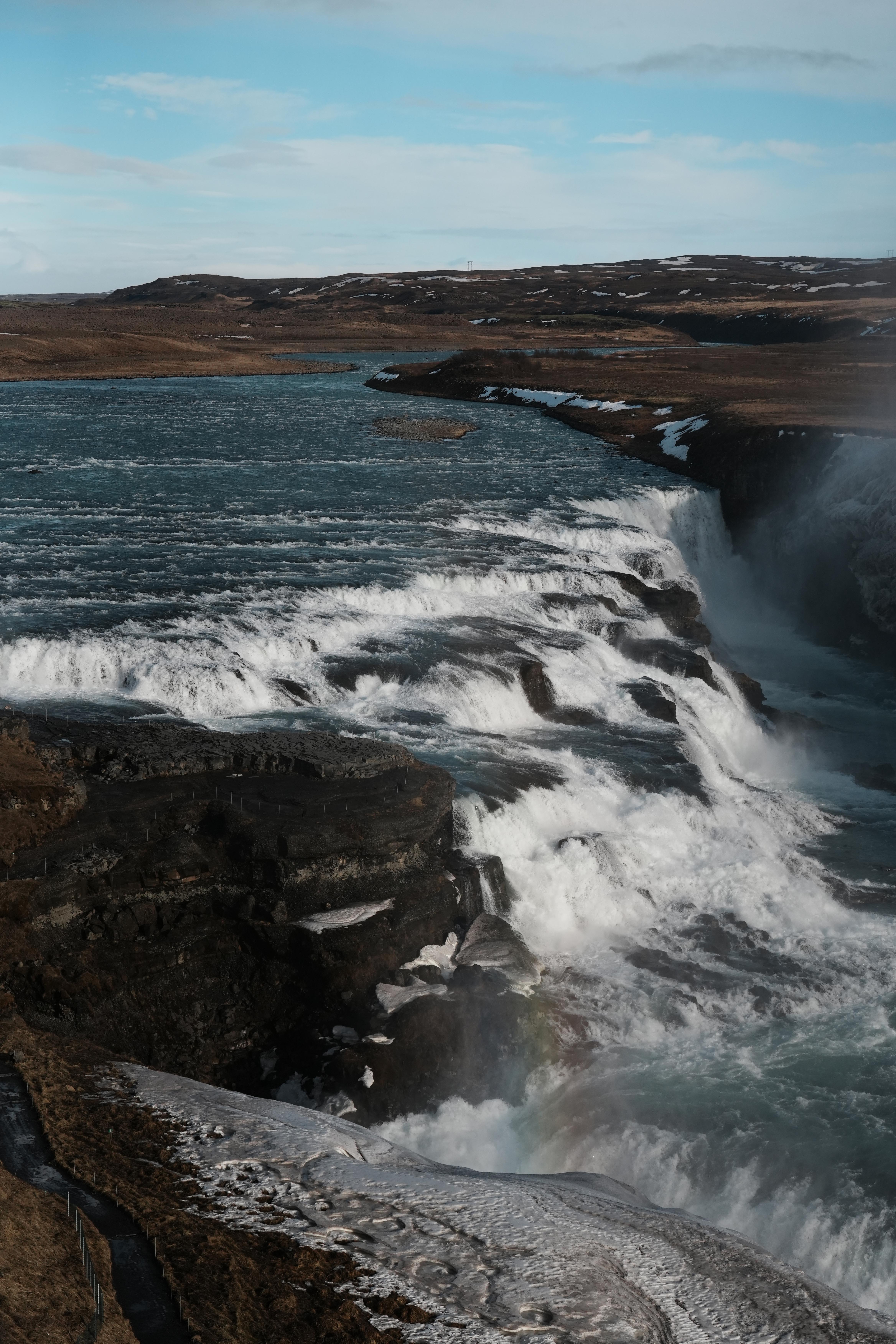 黃金瀑布 Gullfoss:位於冰島著名的黃金圈路線上,是一座壯觀的雙層瀑布。河水自高處洶湧而下,震耳欲聾的水聲與澎湃的氣勢令人難忘。晴日裡,陽光穿過瀑布激起的水霧,灑下金色光輝,美麗而震撼,因此得名「黃金瀑布」。
